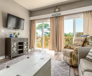 The master suite is a serene haven, featuring a queen bed, personal TV, and access to the rear balcony with gorgeous views of the bay. The luxurious private bathroom includes a double vanity, a corner bathtub, a shower stall, and a private toilet area. The second bedroom is a charming bunk room with a twin-over-full bunk bed, TV, and closet, making it perfect for kids or additional guests. A common bathroom with a shower-tub combo is conveniently located nearby.