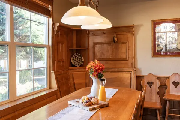 Locally crafted natural wood entertainment center and large dining & nook with built-in bench plus six chairs that easily seats twelve family/friends for meals, table talk, family crafts, and games.