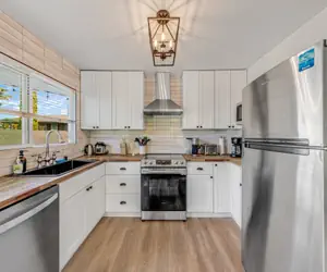 The home combines practicality with style, featuring durable luxury vinyl flooring designed for beach living, ensuring easy cleanup if a bit of sand follows you home. The kitchen is outfitted with sleek wooden countertops, offering both elegance and functionality. Each room has its own AC unit, ensuring comfort throughout the year.