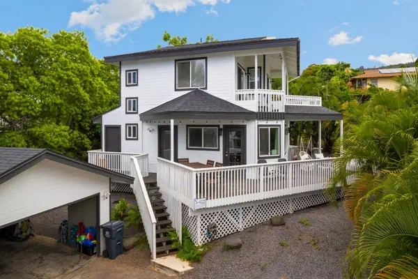 Recently renovated and located in a quiet cul-de-sac, the home is just minutes from some of the island's renowned surf spots and beaches. The contemporary design features vaulted, open beam ceilings, creating a spacious and airy feel. The open-concept floor plan flows smoothly into the living areas, with thoughtful details throughout. Both levels of the home include covered lanais, perfect for family gatherings or simply enjoying the Pacific Ocean views visible from the upstairs bedrooms.