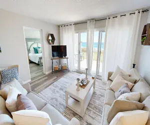 The beautifully decorated kitchen and living room space offer plenty of space for the while family and to enjoy the stunning Gulf Views from all locations. The spacious kitchen has all full-sized appliances. The kitchen is stocked with all the cookware you’d need to cook up a feast for 6 or a quick bite before heading down to the private beach and enjoy your complimentary seasonal beach service. The living room has plenty of comfortable seating options to enjoy the large flat screen TV or the Emerald Waters.