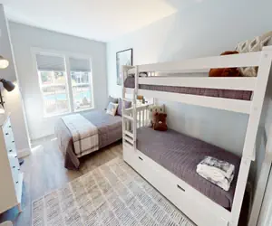 One bedroom has a large King bed. The second bedroom has a Queen bed along with a triple Twin bunk bed. The living room has two Koala sofa beds (Queen and Twin XL).