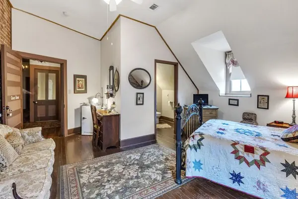 • It is a spacious sized room with a comfy queen bed, patchwork quilt, and a love seat.