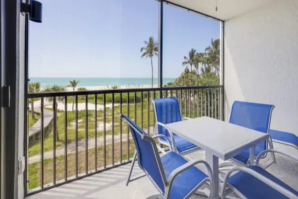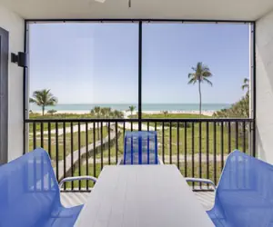 Pelicans Roost is a small complex with only 21 units right on the beach. On three sides, it’s surrounded by palms and tropical vegetation, opening to the sparkling white sand beach and gorgeous Gulf of Mexico. It’s close to shopping, restaurants, the bike path, and tiki bars. Large, heated pool, elevator, and 2 large community gas grills. This is the perfect spot for a Sanibel Island vacation. Oceanfront, White sand beach, Heated pool, 2 large BBQ grills, Elevator, Paved parking, Laundry in unit, large screen TV with Wi-Fi and cable, AC.