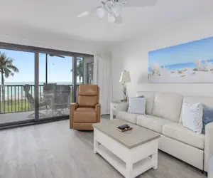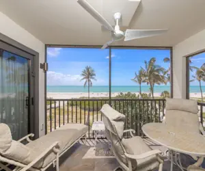 Pelicans Roost is a small complex with only 21 units right on the beach. On three sides, it’s surrounded by palms and tropical vegetation, opening to the sparkling white sand beach and gorgeous Gulf of Mexico. It’s close to shopping, restaurants, the bike path, and tiki bars. Large, heated pool, elevator, and 2 large community gas grills. This is the perfect spot for a Sanibel Island vacation. Oceanfront, White sand beach, Heated pool, 2 large BBQ grills, Elevator, Paved parking, Laundry in unit, large screen TV with Wi-Fi and cable, AC.