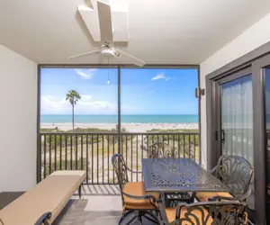 Pelicans Roost is a small complex with only 21 units right on the beach. On three sides, it’s surrounded by palms and tropical vegetation, opening to the sparkling white sand beach and gorgeous Gulf of Mexico. It’s close to shopping, restaurants, the bike path, and tiki bars. Large, heated pool, elevator, and 2 large community gas grills. This is the perfect spot for a Sanibel Island vacation. Oceanfront, White sand beach, Heated pool, 2 large BBQ grills, Elevator, Paved parking, Laundry in unit, large screen TV with Wi-Fi and cable, AC.