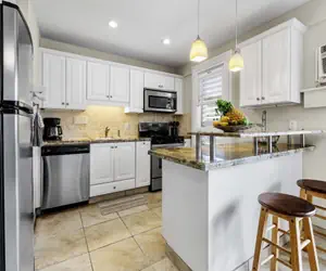 The kitchen is fully equipped with stainless steel appliances, granite countertops, ample storage cabinets, and a breakfast bar.