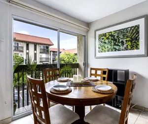 You'll appreciate tile flooring throughout, double-pane windows, and sliding doors that open to embrace the island breezes, this 571-square-foot unit maximizes natural ventilation. For warmer days, air conditioning ensures a refreshing interior in the Living Room, which easily makes its way to the Bedroom.