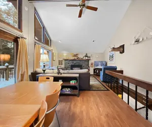 Inside, you'll find five bedrooms and two bathrooms across two levels, designed with warmth and relaxation in mind. The main floor features a bright open-concept living area with a stone propane fireplace, vaulted ceilings, and large windows that fill the home with natural light. Enjoy meals together in the modern kitchen and dining area, or retreat downstairs for quiet evenings and restful sleep in the lower-level bedrooms.