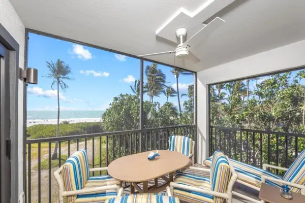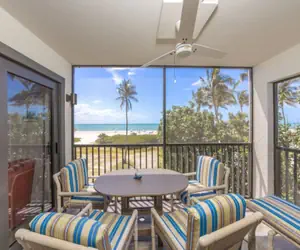 Pelicans Roost is a small complex with only 21 units right on the beach. On three sides, it’s surrounded by palms and tropical vegetation, opening to the sparkling white sand beach and gorgeous Gulf of Mexico. It’s close to shopping, restaurants, the bike path, and tiki bars. Large, heated pool, elevator, and 2 large community gas grills. This is the perfect spot for a Sanibel Island vacation. Oceanfront, White sand beach, Heated pool, 2 large BBQ grills, Elevator, Paved parking, Laundry in unit, large screen TV with Wi-Fi and cable, AC.