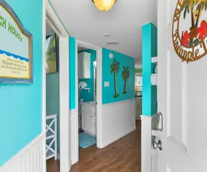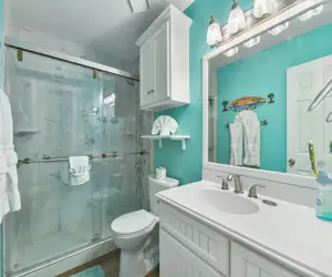 The second bathroom offers a convenient tub and shower combo, perfect for relaxing baths or quick showers after the beach.
