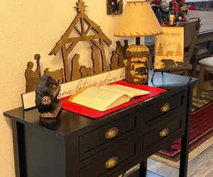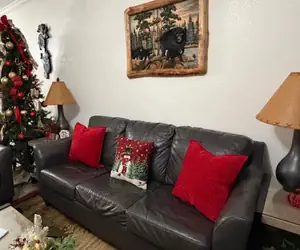 Enter the cozy living room and be enveloped in a warm and inviting atmosphere. Plush furnishings, including a comfortable loveseat and sofa sleeper, invite you to curl up and relax while enjoying the electric stone fireplace, casting a warm glow over the room. The room is tastefully decorated with rustic and modern touches, creating a unique and charming space perfect for unwinding after a day of exploring the Smoky Mountains. With a flat-screen TV and comfortable seating for six, this is the perfect spot to catch up on your favorite shows or watch a movie together. And with plenty of storage space for books, games, and other essentials, you'll feel right at home in this cozy living room.