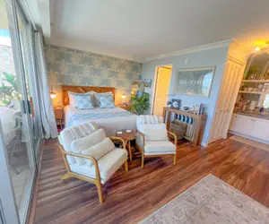 The living & sleeping area split space – a cozy loveseat is located at the foot of the queen size bed (sleeps 2), paired with 2 mid-century modern chairs, plus a 65” flat screen smart TV, atop a boho-modern, Acacia wood media console with extra storage for clothing. Other unique touches include a decorative, traditional wooden surfboard, coffee table books, full length mirror & bamboo luggage rack.