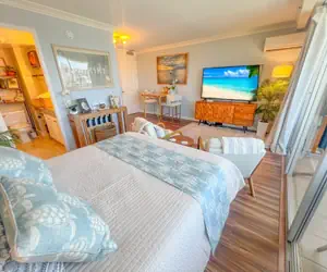 This gorgeous Waikiki studio is located at the beginning of Waikiki with easy access to some of the best Oahu has to offer. At the luxurious “Royal Garden” building, guests are free to enjoy the gardens, pool, sauna, BBQ grills, fitness center, 24/7 laundry room with complimentary washers & dryers, and more great amenities! In addition to AC, free Wi-Fi/cable, and a smart TV, this studio features a private Zen lanai perfect for lounging in the Hawaiian sun & fresh air, plus defined sleeping, living, and dining areas.