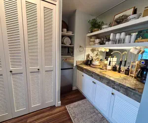 Stylish & well-stocked, this kitchenette includes a small fridge/freezer, microwave, 1800watt induction cooktop, electric kettle, drip coffee maker, French press, ice bucket, cocktail shaker set, dual compartment slow cooker, dinnerware, drinkware, cutlery, kitchen utensils, essential cookware, and more. Extra pantry/closet space located to the left of the kitchenette.