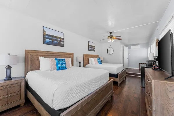 This cozy studio near Table Rock Lake offers a perfect retreat for those seeking comfort and a quick getaway. The room features 2 King beds, and comfortable bedding. The room comes equipped with streaming only flat screen tvs, a mini fridge, microwave, and full size coffee pot.