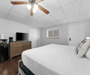 Escape to comfort and convenience at our cozy studio, perfect for couples, families, or solo travelers! This room features a king size bed with soft bedding, a comfortable couch with pull out bed, and a streaming only flat screen tv. This unit also comes equipped with mini fridge, microwave, and full size coffee pot. The bathroom features a walk-in shower, plush towels, and complimentary toiletries to get your trip started.