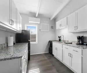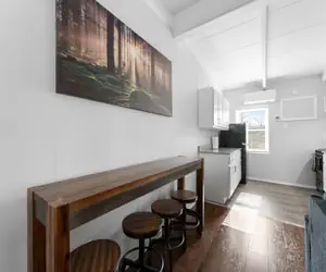 The galley kitchen offers a great place to cook homemade meals before heading out for your day of adventures, or in the evening to have a filling meal to finish the day. Dining area features bar seating by large window.