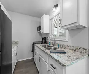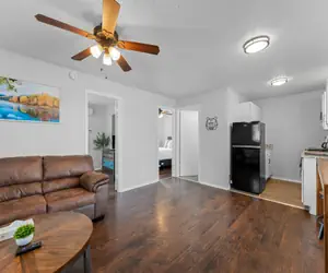Come stay at this modern 2 bedroom suite, located close to Table Rock Lake and Silver Dollar City. It is situated in a cozy little resort just minutes away from all that Branson has to offer. You will walk in to the living area featuring a comfortable couch with pull out bed, and streaming only flat screen tv. This unit features a large window letting in lots of natural light, and looking out at the outdoor pool.