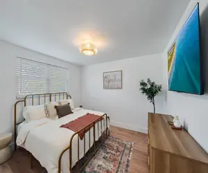 This home comfortably accommodates up to ten guests with its thoughtfully designed sleeping arrangements. The primary bedroom is a serene retreat, featuring a luxurious king-size bed, SMART TV, and an ensuite bathroom with a sleek walk-in shower and modern vanity.