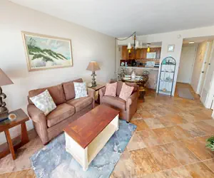 Have a look at this one bedroom, two bathroom beach front condo with Free Beach Service for 2 at Beach House, condo 401D, conveniently located in Miramar Beach Florida. As you enter the condo you will first come to the Kitchen, complete with granite countertops, full size appliances, and all the silverware and dishware needed to prepare a meal. Adjacent to the Kitchen is the Dining Area and a round table set for four guests. Next is the Living Area, home to plenty of comfortable seating, a HDTV, access to the balcony, and a couch that doubles as a Sofa Sleeper to accommodate guests. The Bedroom has a large King bed and a HDTV. The Bathroom has dual vanities and a walk-in shower. As beautiful as this newly updated property is, the Balcony is where Beach House 401D truly shines as it offers an unobstructed view of the crystal white sands and emerald green waters of the Gulf of Mexico. Amenities include a beach front pool, a “kiddie” pool, on site grills, an on-site gym, lighted tennis courts, shuffleboard, and a one-minute walk to the neighboring seafood restaurant “The Surf Hut”.