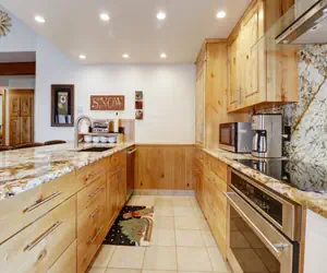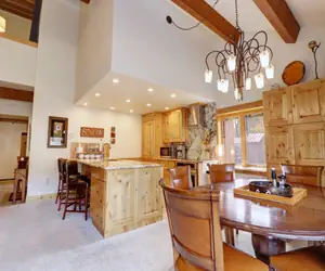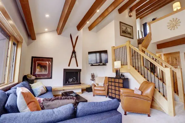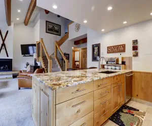 The open-concept living area is bright and inviting, with large windows that allow natural light to flood the space while offering stunning mountain views. You can relax on the comfortable seating while enjoying the warmth of the gas fireplace, or unwind with a movie on the flat-screen TV. The well-equipped kitchen has everything you need to prepare meals, from a quick breakfast before hitting the slopes to a full family dinner in the evening. The adjacent dining area comfortably seats six, making it an ideal spot for gathering together after a day of activities and sharing stories of your adventures.