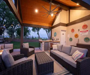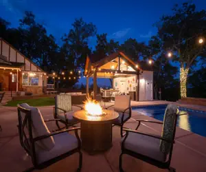 Two bar areas—one with a grill and mini fridge, and another with a sink, mini fridge and storage—perfect for crafting margaritas and entertaining. A heated saltwater pool, hot tub, and two fire pits, each surrounded by comfortable, decorative seating for evening relaxation.
