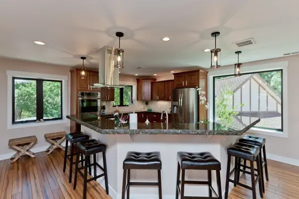 As you step into the main house, you're welcomed by a spacious, well-appointed kitchen—the heart of the home—perfect for cooking and gathering. Just to the right, you’ll find a stylish half bath and the main living room, thoughtfully furnished for comfort and relaxation. Adjacent to this space is a bright and airy reading nook, surrounded by windows and filled with natural light. Nearby, the dining area features a large table that comfortably seats eight—ideal for shared meals and conversation.