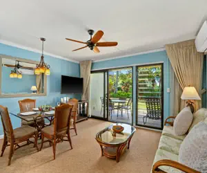 The spacious living and dining area opens to your own private lanai just steps away from the only heated of three pools on the property. The fully equipped kitchen features granite countertops and all the amenities needed to prepare your favorite island fare. The air conditioned bedroom includes a queen-size bed, while the living room's brand new queen sleeper sofa accommodates additional guests.