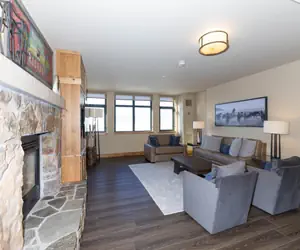 The interiors exude mountain sophistication, with gas fireplaces, tumbled slate accents, granite countertops, and vanities. Guests will enjoy plush carpeting, a mix of slate and hardwood flooring, and elegant mountain-style furnishings throughout. The penthouse includes a spacious galley kitchen, a formal dining area, and walk-in closets, ensuring ample space and convenience. Unwind in the whirlpool tub or take advantage of the in-unit washer and dryer for added comfort.