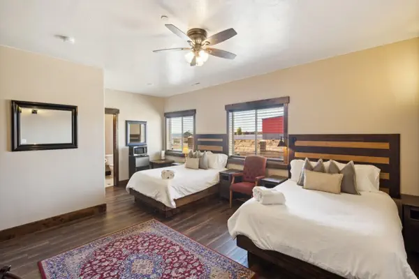 Experience ultimate comfort and relaxation in our Deluxe Suite, thoughtfully designed with two plush queen beds to ensure restful nights. Indulge in the luxury of your private spa bath, featuring a deep soaker tub for unwinding after a day of adventure. Step out onto the shared outdoor deck, where breathtaking views of the surrounding red cliffs and serene landscapes await. This suite offers modern conveniences blended with rustic elegance, including high-quality linens, a cozy seating area, and access to complimentary Wi-Fi. Enjoy proximity to the lodge’s premium amenities, including tranquil romantic decks perfect for stargazing. Whether you're exploring Zion National Park or discovering the hidden gems of Hildale, this suite provides the perfect retreat to recharge and savor the natural beauty of Utah.After a day of exploring, traveling, or working, a comfortable and well-equipped room is essential for relaxation. The lodge's snack bar is stocked with a variety of items to serve your self serve continental breakfast and snack needs 24/7.Dining OptionsTen restaurants and dining facilities are located close to the lodge premises. The locals cater to dietary restrictions and offer a variety of culinary delights. .