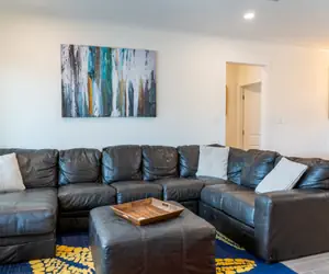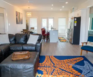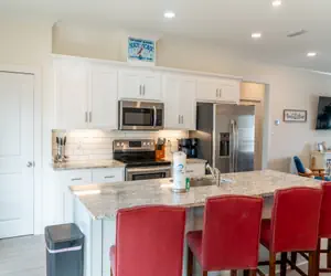 The open-concept living space includes a cozy sectional in the living room with a TV, a fully equipped kitchen with a large island for meal prep or quick bites, and a dining area that seats 8. The laundry closet is conveniently located near the bedrooms.