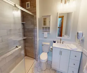 Unwind after a busy day of adventure on the bike trails or ski slopes in this beautiful, large tiled, frameless shower before relaxing on the couch or bed and watching a movie on the large screen TV in front of the cozy gas fireplace.