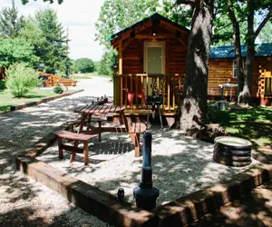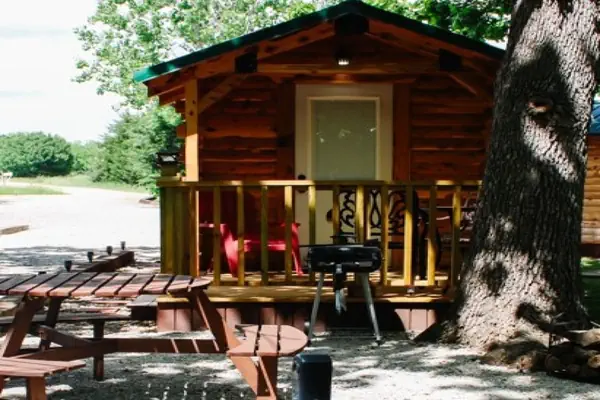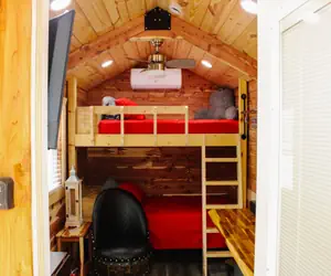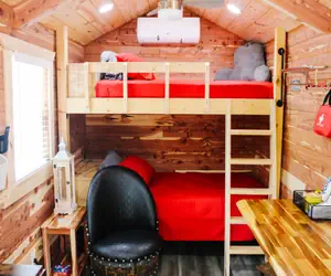 Cabin #3 is called RED and is beautiful Cedar bunkhouse. Located at Split Rock RetreatUnwind in this brand new Amish Built Log Cabin. These cozy single-room cabins sleep 3 - 4 with bunk and folding padded cot. Relax in a cozy space equipped with electricity, TV, WIFI, and climate control. Bring your own groceries and water. Cabin has fridge, microwave and hot plate. Enjoy Morning coffee on the front porch. A short walk to explore the forest and nearby river for fishing, boating, and swimming, or head to the public hunting grounds for an adventure. Communal outdoor sink and Shared bathhouse access for cabin guests. This cabin offers a classic cabin experience, with a detached, private bathhouse and shower just steps away for your convenience. After a day of outdoor fun, spend your evenings dining at the picnic table before cozying up around the wood-burning fire pit for stories and s’mores. Front porch and additional outdoor space is ideal for campfires, conversations, games and more. One Room Studio Brand New Amish Built Log Cabin SLEEPS 3 (4 if super small) Twin Bunk Beds set Twin Folding Bed Satellite Internet Free Wifi Smart TV w/remote Heat & Air Conditioning Ceiling Fan Covered Porch Hotplate Microwave Mini Fridge Coffee Maker w/Coffee Clean Sheets & Pillows Included Picnic Table Fire Pit Free Fire Wood Detached RestroomPlease note: The Amish Log Cabin RED is a fishing/hunting cabin. This cabin offers a classic bunkhouse experience, with a detached, private bathhouse and shower just steps away for your convenience. Enjoy the tranquility and simplicity of this unique setting.BUNK BED DISCLAIMER: By reserving this cabin you have agreed to the following terms and conditions regarding the use of the bunk beds. Use of Bunk Beds. User acknowledges that the use of bunk beds involves certain inherent risks, including but not limited to, falling from the top bunk, injuries from ladders, and injuries from the collapse of the bunk bed. User agrees to use the bunk beds at their own risk. Assumption of Risk. User hereby assumes all risks associated with the use of the bunk beds, including but not limited to, the risk of personal injury, property damage, or death. Indemnification. User shall indemnify and hold Owner harmless from any and all claims, demands, actions, causes of action, or liabilities of any kind or nature whatsoever, known or unknown, suspected or unsuspected, which may be brought or asserted against Owner by any third party arising out of or in any way related to User's use of the bunk beds.
