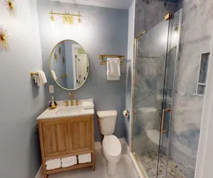 The bathroom was completely renovated to provide a serene spa like showering experience complete with a rain showerhead.