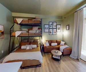 The triple bunk, featuring a twin, over a full, over a king size bed, means there is no hassling with a pull-out sofa.