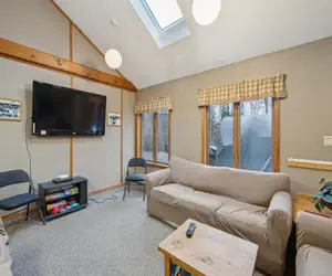 • This townhome comfortably sleeps up to six guests. The master bedroom features a queen-size bed, while the second bedroom includes a full bed and a bunk bed. For additional sleeping space, the living room is equipped with a pullout couch.