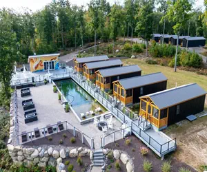 The cabin includes a private bedroom and bath, plus a common room with kitchenette.