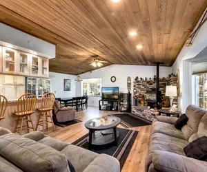 Located in a peaceful cul-de-sac with only one neighboring home across the street, this retreat promises both privacy and tranquility. The expansive living room is perfect for cozy gatherings, featuring a 52" flatscreen TV, high-speed Wi-Fi throughout, and unlimited domestic long-distance calling for convenience.