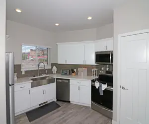 This modern townhome provides a comfortable and functional layout across three levels, offering privacy and convenience in a central location. Guests will enter on the ground floor and ascend the first staircase to the open-concept living space, where the fully equipped kitchen flows seamlessly into the living area—perfect for relaxing or gathering together. A second staircase leads to the top floor, where both bedrooms and the full bathroom are located.