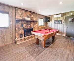 Step inside to a warm and welcoming space featuring a cozy living area, a full kitchen, and a game room complete with a pool table and a selection of board games for endless entertainment.
