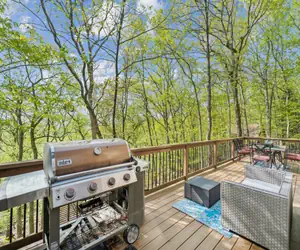 The spacious deck is ideal for grilling out, dining al fresco, or simply relaxing with a drink while taking in the peaceful, wooded surroundings.