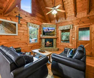 Step into the inviting living room of this rental cabin, where an open floor plan creates a seamless flow between spaces. Relax on the comfortable sofa sleeper, perfect for extra guests, while the flickering glow of the electric fireplace sets a cozy ambiance. Stay connected with complimentary Wi-Fi, and gather around the flat-screen TV for movie nights or catching up on your favorite shows. This welcoming living area is designed for both relaxation and entertainment, making it the ideal spot to unwind after a day of adventure!