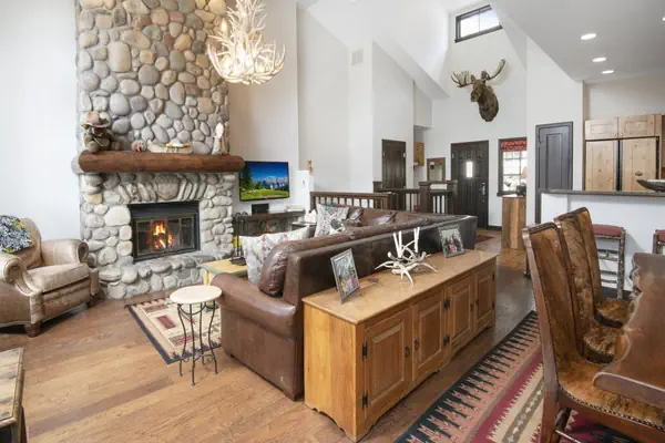 As you step into this magnificent home, you are greeted by an expansive great room, bathed in natural light from floor-to-ceiling windows that frame the majestic mountain vistas. The high vaulted ceilings amplify the space, while a grand granite stone hearth wood fireplace adds a cozy ambiance to the stunning living space. Abstract art intersperses with rustic, upscale mountain décor, infusing modern flair into this alpine haven.