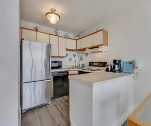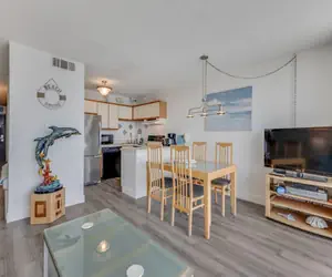 The bright and open living and dining area features large windows that invite natural light and ocean views into your space, making every moment feel connected to the coast. The accompanying kitchen is fully equipped with full‑size appliances, cookware and dishes—whether you’re enjoying a casual breakfast before beach time, a light lunch, or a relaxed dinner in, you’ve got what you need.
