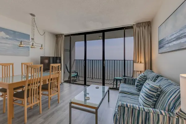 Elevated on the 10th floor, this ocean‑front condo offers an exceptional blend of space, comfort and beachside ambiance for up to six guests. The master bedroom features a plush king‑size bed, providing a restful sanctuary as the sound of waves drifts in. Just off the hallway you’ll find a built‑in bunk‑bed alcove—ideal for children or extra guests who want their own corner. In the living room, a sleeper sofa adds two more flexible sleeping spots, while preserving full living‑area comfort.