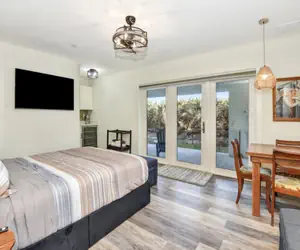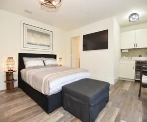 There is a queen bed and smart TV. Includes breakfast table, coffee bar and beverage fridgerator. The unit has black out shades. Also there is a shared outdoor Powder Room and Shower on the first floor.
