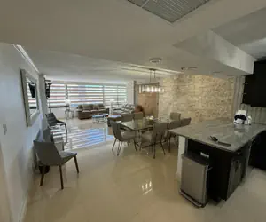 One of a Kind - Brand new 2400 sq.ft. double unit with interconnecting double doors. Apartment 8BA/8AI (I would call it 8BA-19 at The Alexander (8th floor) is an exotic large modern apartment. Perfect for large groups (sleeps as many as 17 singles or 6 couples with 6 private bedrooms and 5 bathrooms ) or for bachelorette groups. Two 20 ft. balconies with amazing ocean, city and intercoastal water views. Primary bedroom in unit 19 has 2 double queen beds and a private bathroom. The second bedroom has 3 twin beds 2 of which can be assembled as a king. Connecting unit 8BA Master bedroom has three twin beds, 2 of which are joined and are a king (upon request can be separated as 2 or 3 twins) so that room sleeps 3 and has its own accessible full bathroom with his and her shower. The guest bedroom has same set up as master bedroom, but bathroom is in adjacent hallway. Bedroom 3 has no window with 2 twin beds which can be assembled as a king double. Bedroom 4 off the living room has 2 twin beds also can be assembled as a king double. Between the double unit when connecting, there are five bathrooms, one accessible in each master bedroom and 4 are in hallway opposite guest bedroom, one of which has a bathtub shower combination. Amenities includes unlimited Wi-Fi, 8 smart TV s with expanded cable channels, an electric fireplace in 8BA, 2 separate full state-of-the-art kitchens, wall safe in each master bedroom, 2 dining tables that each seats 8 and so much more. This apartment sleeps 12-17 guests (rate displayed includes up to 12 guests, each additional guest $45 per night up to 17 guests).