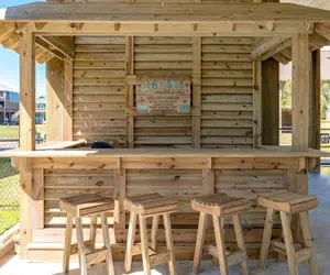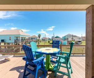 Enjoy coastal breezes and gulf views from the expansive deck, furnished with comfortable outdoor seating for lounging or dining al fresco. Downstairs, you’ll find an outdoor bar area on the ground level, ideal for mixing up your favorite cocktails and enjoying the laid-back beach vibes.