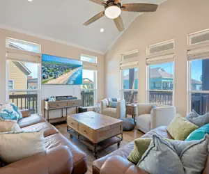 Step inside to an inviting open-concept living space with coastal décor, plush seating, and plenty of natural light. The well-stocked kitchen is a chef’s dream, featuring modern appliances, an under-counter ice maker, and ample prep space—perfect for whipping up your favorite beachside meals.